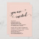 Voici un choix amusant et simple pour vos besoins de célébration après le mariage. Sur un fond modifiable, j'ai placé un graphique typographique qui indique "vous êtes invités" avec une police de caractères élaborée ornée de cœurs. En dessous, vos informations apparaissent dans une police simple en majuscules. Utilisez les champs du modèle pour ajouter vos propres informations et cliquez pour personnaliser davantage si vous souhaitez apporter d'autres modifications. Changez le fond rose blush en n'importe quelle couleur que vous aimez. Toutes les couches sont déverrouillées pour vous permettre de contrôler le positionnement et la taille comme vous le souhaitez.