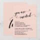 Voici un choix amusant et simple pour vos besoins de célébration post-mariage. Sur un arrière-plan modifiable, j'ai placé un graphique de typographie qui indique "vous êtes invité" avec une police de caractères élaborée ornée de cœurs. En dessous, vos informations apparaissent dans une police simple en majuscules. Utilisez les champs de modèle pour ajouter vos propres informations et cliquez pour personnaliser davantage si vous souhaitez apporter d'autres modifications. Changez l'arrière-plan rose blush en n'importe quelle couleur que vous aimez. Toutes les couches sont déverrouillées pour vous permettre de contrôler le positionnement et la taille comme vous le souhaitez.