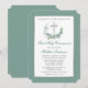 Elegant Watercolor Eucalyptus Leaves Wreath First Holy Communion Invitation. Silver Frame and Cross.