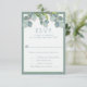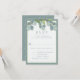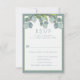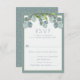 Carte de réponse faire-part de mariage Eucalyptus en orientation verticale. Un sangle d'aquarelle avec des feuilles gris-bleu est accroché au sommet avec un aspect superposé. Le texte de réponse est imprimé en style de police mince sur un arrière - plan blanc cassé bordé de gris foncé-bleu. Le libellé est pour une réponse au menu avec une liste de choix de repas pour les clients. Le libellé peut également être changé en une simple carte de réponse sans le menu. Mélanger et correspondre avec d'autres modèles d'eucalyptus dans cette collection. *Affichez l'image NON in situ pour voir les sélections de papier de plus près.