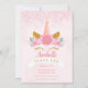 Une invitation moderne, girly et fantaisiste de premier anniversaire conçu avec une mignonne corne de licorne, des cils rose vif et souriants bouclés et une calligraphie chic lettrage du nom de la fille d'anniversaire avec une arrosée de délicate parties scintillant en or rose au centre supérieur. L'arrière de l'invitation est orné de rayures arc-en-ciel aux couleurs pastel.