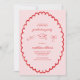 Des gribouillis dessinés à la main en rouge sur un arrière - plan rose avec un joli ovale de pétoncle font ressortir cette initiation de fête de graduation. Il y a un diplôme, un grand casquette et un arc coquette. C'est un invitation à la mode et doux. Voir la coordination des articles dans notre boutique, Enchanted Finch.
