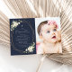 Invite friends and family in style and set the tone for your special day with this elegant confirmation invitation. Design features white watercolor flowers, greenery and gold frame on navy blue background.