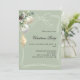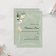 For a Christmas party with family and friends. An elegant, modern sage green background. Decorated with gold and white baubles, some greenery a pine cone and a hand-drawn bow. Personalize and add the details.