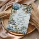 This winter blue floral Quinceañera design blends icy hydrangeas, frosted berries, and soft watercolor textures for a magical seasonal look. Cool-tone botanicals and delicate pine branches create a sophisticated winter garden atmosphere around your celebration details. The subtle snowy background adds a dreamy, elegant feel, perfect for a late-fall or winter Quinceañera. Personalize the text to create a beautiful keepsake worthy of this milestone event.