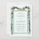 This wedding invitation features a watercolor winter greenery garland adorned with pine branches, holly berries, botanical foliage, gold ribbon bows, and elegant calligraphy. For more advanced customization of this design, please click the BLUE DESIGN TOOL BUTTON above! Matching items are also available.