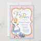 Wonderland tea party invitation avec Alice mignonne et set de thé sur un joli damas rose et arrière - plan bleu. Cette jolie invitation à la fête du thé Wonderland rose, bleu et or est facilement customisée pour votre événement en ajoutant simplement vos détails dans le style de police et la couleur de votre choix. Il s'agit d'un dessin imprimé sans véritable parties scintillant.