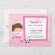 Le football n'est pas seulement pour les garçons ! Une fille peut aussi aimer le football ! Cette invitation rose et blanche est parfaite pour la fille d'anniversaire qui aime le sport de football. Elle présente une mignonne fille avec une queue de poney qui est dans un maillot de football blanc avec des rayures roses, des shorts roses et des bottes de football assorties. Elle sait aussi gérer un ballon de football. La page inverse est le motif des étoiles roses. Personnalisez facilement vos détails de fête!