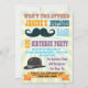 Invitation à la fête d'anniversaire de la moustache, hip et amusante, casquette de derby de bowler et affiche de sunburst comme un arrière - plan désuet avec des polices graffiques audacieuses. Idéal pour tout âge ou genre. Changez le libellé "fête d'anniversaire" pour n'importe quel type de fête que vous aimeriez, comme une fête de bachelor ou de bachelorette. Illustration tirée à la main par McBooboo. Veuillez me contacter pour toute question, modification ou problème!