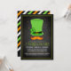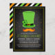 Invitations de fête du jour Saint Patrick amusantes avec un chapeau vert festif, moustache rouge auburn et confettis colorés aux couleurs du drapeau irlandais.