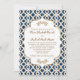 Elégante et belle invitation au mariage inspirée par le carrelage marocain français avec une tonalité marine bleue et des trellis géométriques or motif et des fleurs dorées huées or. Cette invitation de mariage haut de gamme et luxueuse est idéale pour un mariage à thème marocain, arabe ou aladin. Le verso de ces invitations et annonces personnalisées et fantaisistes peut être personnalisé avec le monogramme de la future mariée et du mariée et les noms sur la forme de la feuille de carapace. Artisanat et design © Chrissy H. Studios, LLC.Tous droits réservés.