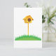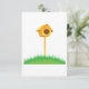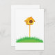 Ce design est une maison d'oiseaux. La maison des oiseaux est sur un poteau au milieu d'une pelouse verte. Ce modèle de maison d'oiseaux a une grande allure sur ces invitations
