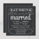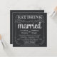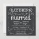 Mangez, buvez, et soyez marié -- Invitations rustiques de mariage campagnard de style vintage -- Les rouleaux tourbillonnants et bouclés et la typographie de vieux-mode sur le charbon de bois unique noircissent l'arrière - plan de toile de jute. Ajoutez vos noms et information de épouser dans ce modèle facile à utiliser. Élégant mais amusement et lunatique, l'écriture de manuscrit de style de tableau peut être modifiée pour votre rétro thème formel ou semi-formel de mariage. Le style moderne décontracté est parfait pour des mariages contemporains à la mode avec un contact d'amusement de charme sophistiqué pour les jeunes mariés traditionnels. Veuillez nous contacter pour l'aide avec la personnalisation si vous avez besoin de la pièce supplémentaire pour vos détails de mariage. D'autres tailles et styles de tableau disponibles, avec des styles coordonnés pour la partie de fiançailles et la douche de couples. NOTE : Cette conception de produit est installée pour les cartes carrées seulement -- exige l'affranchissement supplémentaire.