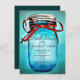 Voici une invitation nuptiale unique de douche pour une jeune mariée de pays. Ceux-ci comportent un pot de maçon rustique en aqua teinté bleu avec un arrière - plan bleu. Le pot de maçon a un arc rougeâtre orange brûlé attaché autour de lui. Ce sont parfaits pour les jeunes mariées qui auront un mariage de style campagnard.
