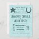 Une invitation fraîche de mariage campagnard de style de typographie avec l'étoile rustique en haut à gauche au faisant le coin et un fer à cheval du côté droit. L'arrière - plan est motif assez bleu de Paisley. C'est une grande invitation pour un mariage de style campagnard, le mariage de thème de pays, ou le mariage de cow-girl et de cowboy.