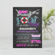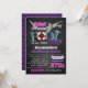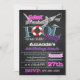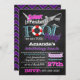 Des invitations d'anniversaire de réception au bord de la piscine de requin de tableau - comportez un arrière - plan de tableau sur l'avant dans un thème nautique avec des éléments de conservateur et de bannière de vie. Couleurs de caractéristiques de conception des roses indien, de l'aqua, du pourpre, du gris, du blanc et du noir. Le thème principal est une grande silhouette d'un grand requin blanc au dessus. Le dos comporte un arrière - plan assorti de tableau avec la copie de chevron au-dessus du dessus aux nuances de pourpre et de blanc.