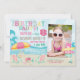 Le thème de la plage avec parasol, chaises, château de sable, lunettes de soleil, coquillages et vagues de l'océan avec photo insert carte d'invitation à l'anniversaire.