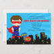 Jolies invitations d'anniversaire super-héros pour les garçons avec super garçon et arrière - plan sunburst bleu.