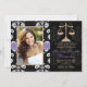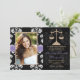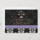 Ajoutez votre image de photo ou de favori à ces annonces et invitations florales noires et blanches élégantes et formelles d'obtention du diplôme d'école de droit de damassé avec des échelles d'un or de conception de justice et de conception imprimée de regard de ruban piquée par pourpre. Customisez-le pour dire celui que vous vouliez sur l'arrière et avant des annonces et des invitations d'obtention du diplôme de diplômé d'avocat. © Chrissy H. Studios, LLC d'illustration. Tous droits réservés.