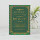 Ces invitations à des soirées bachelorette sont dotées d'une palette de couleurs vert et or, d'un cadre géométrique, de motifs géométriques et d'autres détails stylistiques inspirés de l'Art Déco et des années folles. Vous pouvez customiser les champs de texte exemples à votre convenance.