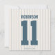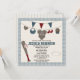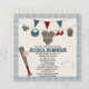 Belle invitation à la douche pour bébés sur le thème du baseball rouge et bleu et invitations avec un casquette de baseball sur le thème du baseball et plus de vêtements sur le thème du baseball accroché à une ligne de vêtements. Une ligne rouge et bleue est suspendue au-dessus. Bien sûr, une invitation à thème de baseball ne serait pas complète avec une chauve-souris de baseball, balle et plaque d'accueil sur une en vichy mignonne frontière bleue et blanche. Ajoutez l'année de naissance et le nom de famille de votre bébé sur le modèle de maillot au dos de la carte. Oeuvre et illustration © Chrissy H. Studios, LLC. Tous droits réservés.