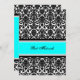 Invitations personnalisées Bat mitzvah dans élégant bleu turquoise aqua clair, noir et blanc classique motif damassé floral classique. Ajoutez votre nom et les détails de votre fête pour une invitation unique et élégante pour une fête Bat mitzvah.