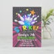 Cartes d'invitation d'anniversaire de bowling avec une boule de bowling frappant les quilles avec des couleurs vives et des étoiles sur un fond sombre qui dit Strike Allons jouer au bowling.
