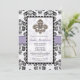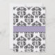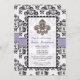 Jolie fleur de lis nuptiale invitation avec un coeur et contrasté mousseline violet et noir ruban design et légèrement défoncé noir et blanc bordé damassé. Oeuvre et design © Chrissy H. Studios, LLC. Tous droits réservés.
