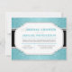 Élégantes invitations modernes à la douche nuptiale avec un motif damassé turquoise accentué d'une bande noire et blanche, et un design typographique turquoise et gris.