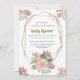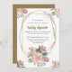 Belle et délicate invitation au baby shower avec roses pastel peints à la main, hydrangées et pivoines dans les tons roses, accentués de feuilles d'eucalyptus. Votre libellé est entouré d'un cadre doré avec des confettis comme des mousseux (imprimé plat - pas un papier d'aluminium) Personnalisez facilement cette élégante invitation avec vos détails de baby shower.