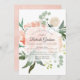 Belle et délicate invitation au baby shower avec roses pastel peints à la main, hydrangées et pivoines en pêches et crème, accentuée de feuilles d'eucalyptus verts. Personnalisez facilement cette invitation élégante avec vos détails de baby shower.