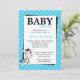 Une invitation moderne au baby shower zébrée en turquoise bleu et noir. Parfait pour un petit baby shower de fille ou de garçon ! Graphiques © Doodles de trappin à www.scrappindoodles.com