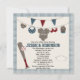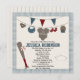 Des invitations à des douches pour bébés sur le thème du marron/hammam et du baseball bleu et des invitations avec un casquette de baseball sur le thème du baseball et plus de vêtements de baseball sur le thème du baseball accrochés à une ligne de vêtements. Une ligne rouge (marron/burgandy) et bleue pennant trône au-dessus. Bien sûr, une invitation à la base-ball ne serait pas complète avec une batte de baseball, une balle et une assiette de base-ball sur une jolie en vichy bleue et blanche. Ajoutez l'année de naissance et le nom de famille de votre bébé sur le dessin de la chemise de maillot au dos de la carte. Illustration © Chrissy H. Studios, LLC.Tous droits réservés.