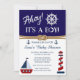 C'est un garçon ! Cette précieuse invitation à baby shower présente un thème nautique et dispose d'un phare, d'un voilier et d'un couloir de roue de bateau dans une palette de couleurs marine, rouge et blanche.