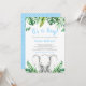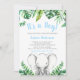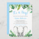 Adorable invitation à l'baby shower d'éléphant de garçon avec feuilles tropicaux aquarelles et éléphant de bébé.