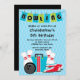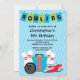 Commencez votre fête d'anniversaire de garçon outre de la droite avec notre grève mignonne vers le haut d'une certaine invitation de fête d'anniversaire de bowling d'amusement comportant un sac de bowling, les goupilles de bowling, la boule de bowling et les chaussures de bowling réglés sur un arrière - plan de rayure bleue. Le dos de l'invitation comporte une couleur noire coordonnée. Entièrement personnalisable par vous avec votre information. conceptions ©Babystar