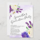 Un design floral Boho Chic comprend des pivoines blanches crémeuses, des fleurs violettes et des feuilles verts. Un lavage à l'aquarelle mauve souple définit le haut et le bas de l'invitation de la fête de graduation. La fête d'obtention du diplôme et le nom du diplômé sont écrits dans une police de hanche et tendance et placés sur la diagonale. Les détails de la fête de remise des diplômes sont écrits en une simple police. Très facile à lire et à modifier. Le dos de l'invitation est un violet profond. i