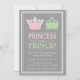 Princesse ou Prince Royal Crown / Tiara Genre Reveal Party Invitations (Pale Pastel Mint Green / Light Pink)...Cet invitation amusant, mignon et adorable est la façon parfaite de demander à des amis, à la famille et aux proches de venir à votre sexe révéler la fête pour découvrir le genre de votre futur paquet de joie. Les célébrités ne sont pas les seules qui peuvent s'amuser avec le genre révèlent la tendance. Est-ce que votre petit pain au four est une fille ou un garçon ? Vont-ils porter du rose ou du bleu ? Est-il temps de stock sur un cigare garçon ou un cigare fille ? Tout le monde découvrira à la soirée révélateur de genre. C'est le moyen idéal de faire savoir à maman et à papa ce qu'ils attendent. C'est une excellente façon de faire connaître aux grands-parents le genre de leur nouveau-enfant. Faites savoir à tout le monde quelle couronne couleur (ou tiara) ramasser! Idéal pour un thème royal du genre révéler la fête (ou le baby shower). Awesome pour les parents qui sont en pourcentage, sont dus à peu près au même moment que la famille royale, ou qui ont l'intention de gâcher leur futur petit prince ou princesse. Convient à un roi et à une reine qui attendent d'accueillir leur nouvel enfant dans le château ! Voir WindyCityStationery.com pour notre ligne complète de genre "Princesse ou Prince Crown", révéler les invitations à des fêtes ainsi que les timbres-poste correspondants, étiquettes, autocollants, invitations et plus.