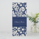 Cartes de faire-part de mariage en bleu marine élégant et blanc classique motif damassé floral classique. Customisez ces invitations avec vos coordonnées de mariage. Disponible en produits assortis pour tous vos besoins mariages.