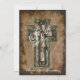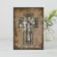 Rustic Country Western Cross Wedding Invitations avec un design de croix en relief unique avec un arrière - plan marron grunge ancien et un design croisé turquoise turquoise. Un côté dit "Amour" et les prénoms de la mariée et du marié. L'autre côté a un motif de papier de défilement ancien sur la croix qui est fondu dans le arrière - plan, pour que vous puissiez lire plus facilement le libellé faire-part de mariage. Ajoutez simplement votre texte au modèle pour faire vos propres invitations mariages campagnards.