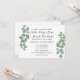 Belle invitation présente des feuilles d'eucalyptus vert frais sur arrière - plan blanc propre à l'avant et à l'arrière. Parfait pour les mariage à thème printemps, été, extérieur ou verdoyant.