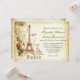 invitation de mariage vintage design pour mariages à Paris, France. Tour Eiffel peinte avec dessin rose et papillons, belle typographie, arrière - plan de papier marron ancien et quelques accents d'antiquités tourbillonnant.