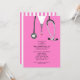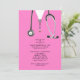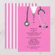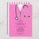 Invitations de la fête de remise des diplômes de l'école de médecine créative mettant en vedette des gommages d'hôpital rose et du stéthoscope. Modifiez le texte pour créer une invitation unique de la fête du médecin ou de la faire-part d'études de médecine.