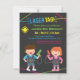 Organisez une fête d'anniversaire amusante en organisant la fête dans un centre de jeux de tags laser! Testez l'agilité des enfants invités, le but et les compétences de travail d'équipe. Cet invitation a un mignon garçon et une fille avec une queue de poney habillée de linges à laser et tenant des pistolets à laser. Différents luminaires laser néon tournent autour avec le titre "laser tag" qui n'est pas modifiable. Convient aux enfants et aux adolescents, surtout aux garçons d'anniversaire ! Personnalisez-vous facilement avec les détails de votre fête.