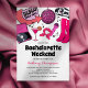 Invitations de bachelorette cowgirl de l'espace avec une sélection d'objets roses rétro comme une discothèque, un lecteur de disques, des bottes cowgirl, micro, cocktails et casquette de rodéo, ainsi qu'un modèle de bachelorette moderne et amusant, facile à personnaliser, y compris un itinéraire de week-end à l'arrière.