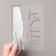 Le bord gauche de cet élégant mariage moderne, sauf la carte de date, comporte une bordure en aquarelle grise et blanche décorée d'une parties scintillant en faux argent. Le texte personnalisable combine écriture manuscrite grise au fusain, copperplate et polices italiques sur un arrière - plan transparent clair.
