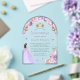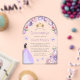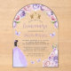 Cette jolie invitation en arc en forme de quinceañera acrylique présente une bordure supérieure de roses violettes pâles et roses rousses qui surplombe une tiare dorée. Une fille aux cheveux foncés en robe de princesse lavande et de petits papillons lavande décorent le texte. Le mot "Quinceañera" et le nom de l'invité d'honneur apparaissent dans un élégant script d'écriture de lavande, avec le texte restant en police grise sans serif sur un choix d'un arrière - plan acrylique clair ou gelé.
