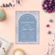Une invitation de confirmation garçon bleue qui combine l'ancien et le nouveau : une arche bleue moderne sur un motif floral bleu vintage sur arrière - plan transparent. Dans la partie supérieure de l'arc il y a une croix avec du texte voûté au-dessus. Le nom est écrit en script. Les infos de cérémonie et de réception sont sur deux colonnes séparées par une ligne. Le texte et les lignes sont blancs, l'arrière - plan est un vintage Morris floral bleu du 19ème siècle motif : "Merton" de Kate Faulkner, de 1888, maintenant dans le domaine public.