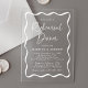 Invités Invitations à votre dîner de répétition en style avec nos invitations à dîner de mariage moderne White Wavy Frame. Le design comporte les mots "Dîner de répétition" affichés dans un script blanc manuscrit, en contraste avec un arrière - plan acrylique transparent. Une bordure blanche ondulée entoure les détails de votre dîner de répétition. Cette invitation à la répétition rétro est parfaite pour des dîners de répétition décontractés et modernes.