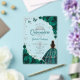 Emerald green silver Quinceanera celebration acrylic invitation. Features brunette girl in ball gown dress, script font, silver butterflies, roses and tiara. Perfect for an elegant princess style glam celebration. Personalize with your own details. Stylish transparent or frosted acrylic invitations.